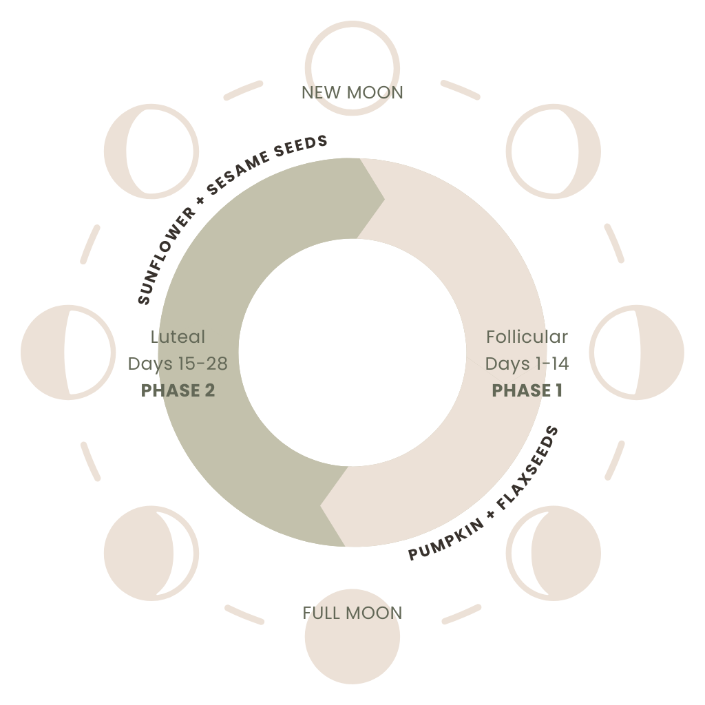 PHASE 1: From day 1-14 of your cycle, add 2 tablespoons to your smoothie, yoghurt bowl, porridge, salads or soups. Alternatively if you follow the moon phase, start taking on the new moon.